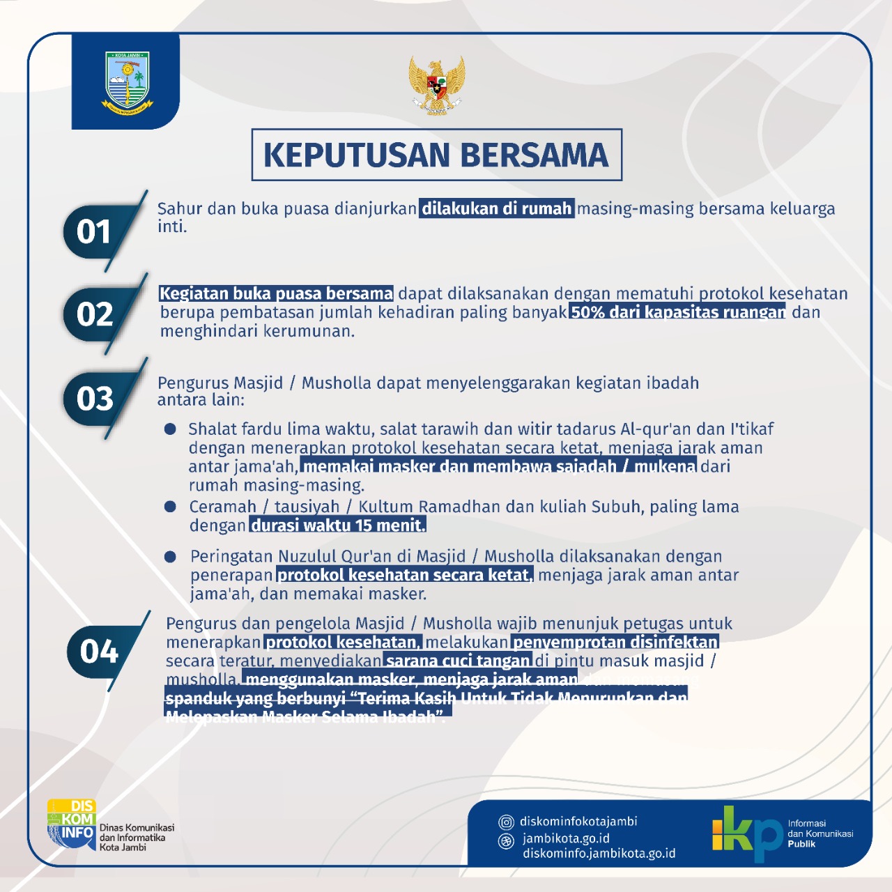 Kebijakan seperti salat tarawih dan tadarus yang bisa dilaksanakan di masjid dengan tetap menerapkan protokol kesehatan, hanya ibadah salat tarawih kemudian tadarusan kemudian salat berjamaah di masjid yang diperbolehkan teteapi masih dengan catatan kesehatan.