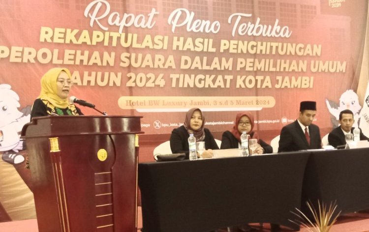 Ketua KPU Kota Jambi Deni Rahmat menjelaskan progres rekapitulasi di kota Jambi. Ia juga memastikan keterlambatan rekapitulasi dari kecamatan Alam Barajo tidak akan menggangu proses rekapitulasi tingkat Kota Jambi.