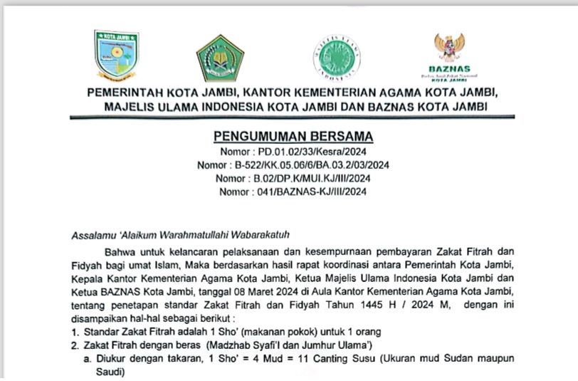SEPUTARJAMBI.COM-Pemerintah Kota Jambi bersama Kantor Kementerian Agama Kota Jambi, Majelis Ulama Indonesia (MUI) Kota Jambi dan Baznas Kota Jambi mengeluarkan pengumuman bersama terkait zakat fitrah 1445 H/2024 M.
