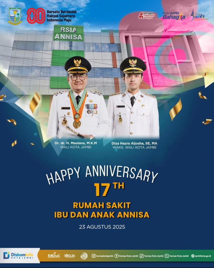 Menutup sambutannya, atas nama Pemerintah Kota Jambi, Wali Kota Maulana menyampaikan ucapan selamat ulang tahun ke-17 kepada RSIA ANNISA. Ia berharap rumah sakit tersebut terus berkontribusi dalam pembangunan bidang kesehatan, sejalan dengan motonya “Wujudkan Keluarga Barokah.”