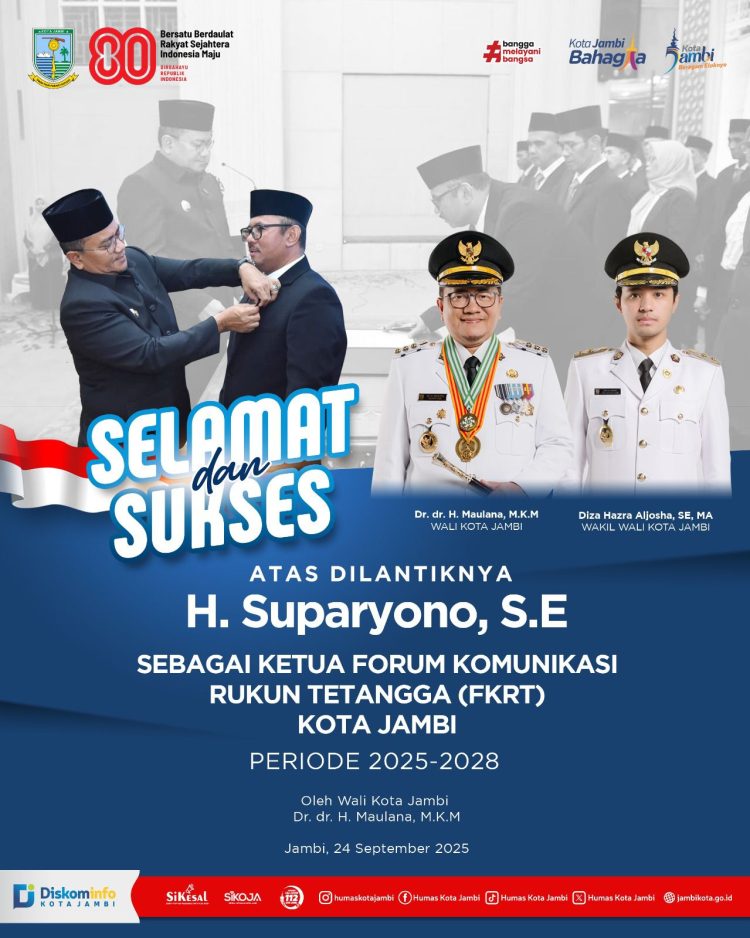 “Mudah-mudahan pada masa pengabdian kedua ini, Bapak H. Suparyono dapat semakin memberikan kontribusi nyata dan manfaat yang lebih besar bagi masyarakat Kota Jambi,” ujar Maulana.