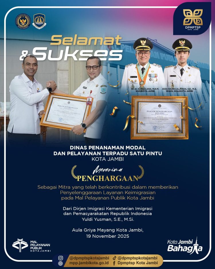 SEPUTARJAMBI.COM-Dinas Penanaman Modal dan Pelayanan Terpadu Satu Pintu (DPMPTSP) Kota Jambi kembali menorehkan prestasi membanggakan. DPMPTSP Kota Jambi diganjar Penghargaan dari Direktorat Jenderal Imigrasi, Kementerian Imigrasi dan Pemasyarakatan Republik Indonesia sebagai Mitra Berkontribusi dalam Penyelenggaraan Layanan Keimigrasian pada Mal Pelayanan Publik (MPP) Kota Jambi. Penghargaan itu diserahkan oleh Kepala Kantor Wilayah Direktorat Jenderal Imigrasi Jambi, Petrus Teguh Arianto, dalam sebuah acara selebrasi di Aula Griya Mayang, Rumah Dinas Wali Kota Jambi, Rabu (19/11/2025).