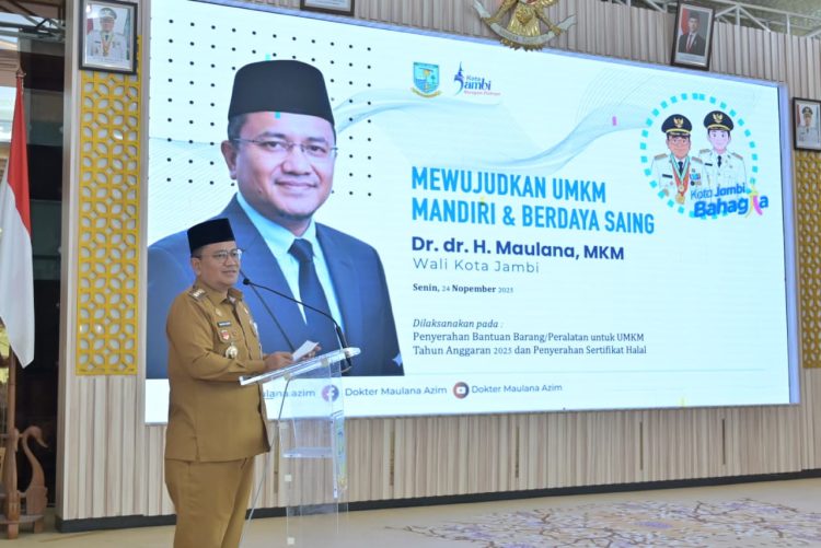 menyerahkan bantuan peralatan usaha dan sertifikat halal kepada para pelaku Usaha Mikro, Kecil dan Menengah (UMKM) Kota Jambi, pada Senin pagi (24/11/2025), bertempat di Aula Griya